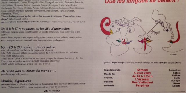 Samedi 05 avril 2003. Pour la deuxième fois consécutive, la ville de Perpignan a abrité un festival des langues grandeur nature. Initiée par le GFEN66 dans le cadre du Mouvement des Forums des Langues du Monde, cette manifestation linguistique et culturelle a eu un grand succès auprès du public perpignanais et des polyglottes du département et d’ailleurs, venus nombreux répondre présents à cet appel qui mobilise plus d’un aujourd’hui.
