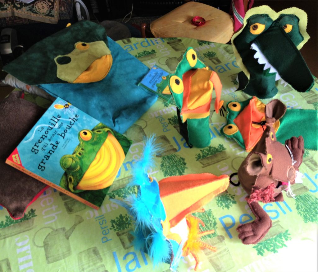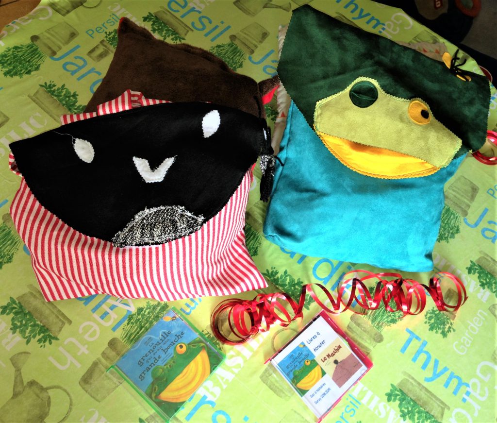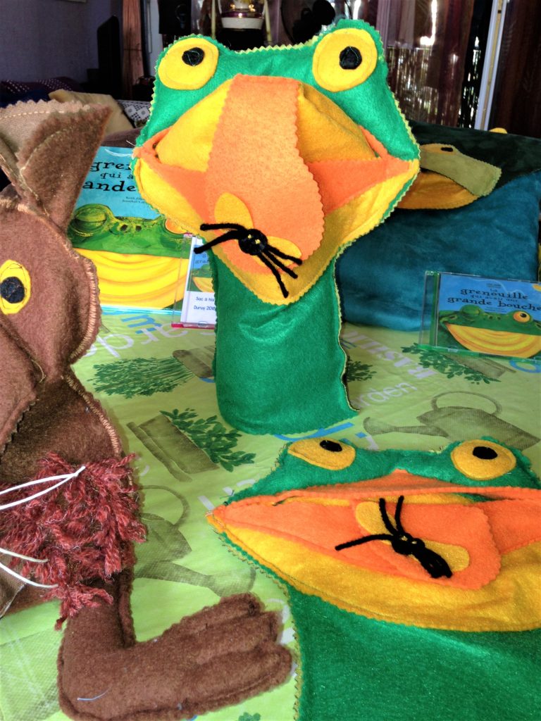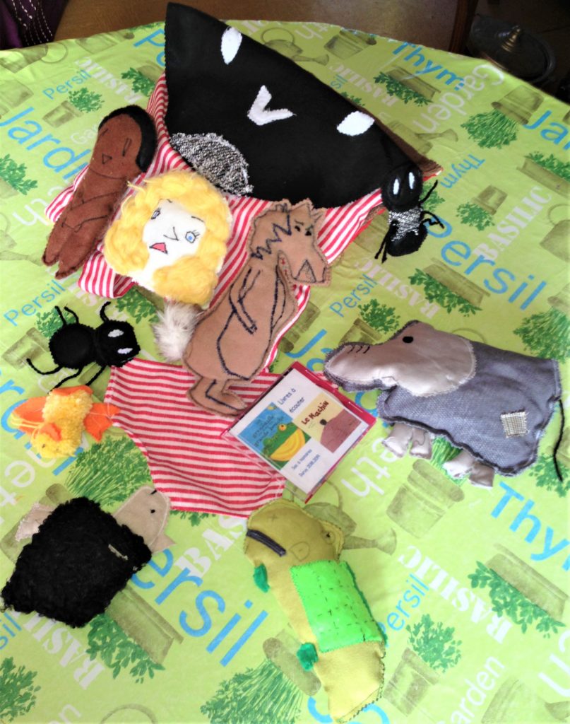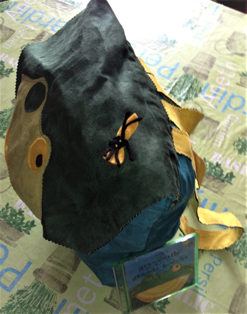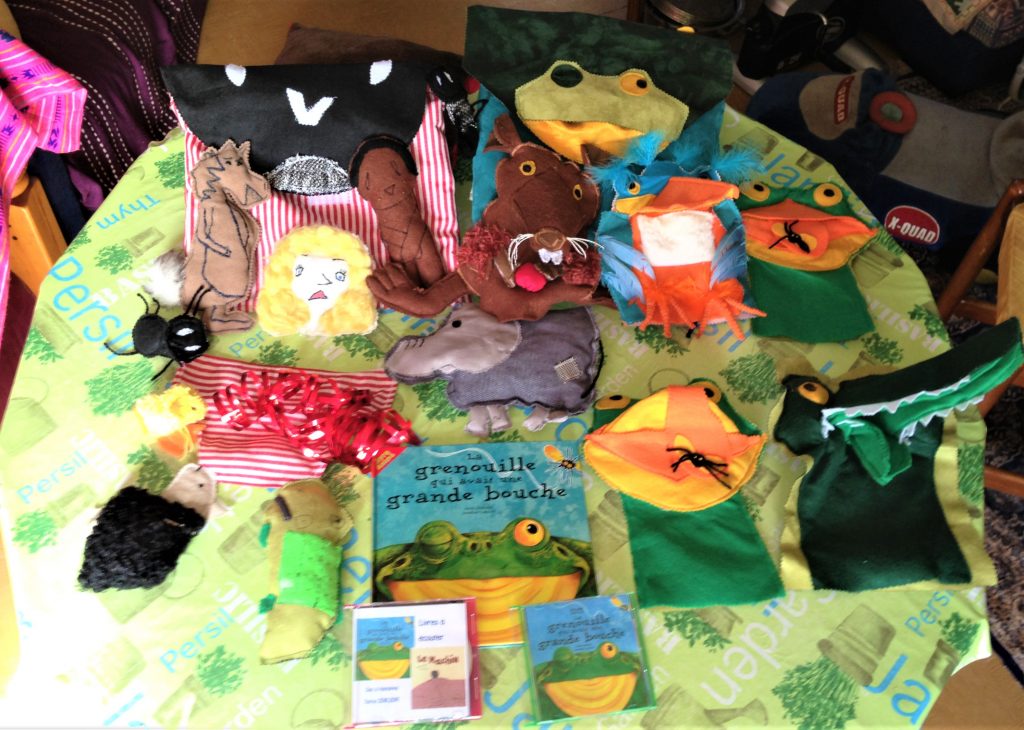 Nous avons fabriqué en tout 12 sacs , 6 pour le thème de la grenouille et 6 pour la fourmi. Bien sûr, ils sont remplis de surprises : on y trouve tous les personnages du livre en marionnettes et un livre, accompagné d’un CD audio qui contient le conte de la grenouille à grande bouche en 7 langues (français, arabe, espagnol, turc, portugais et italien).