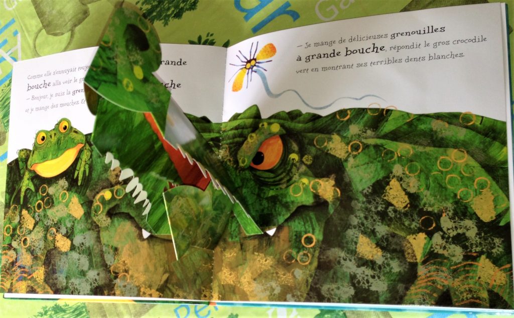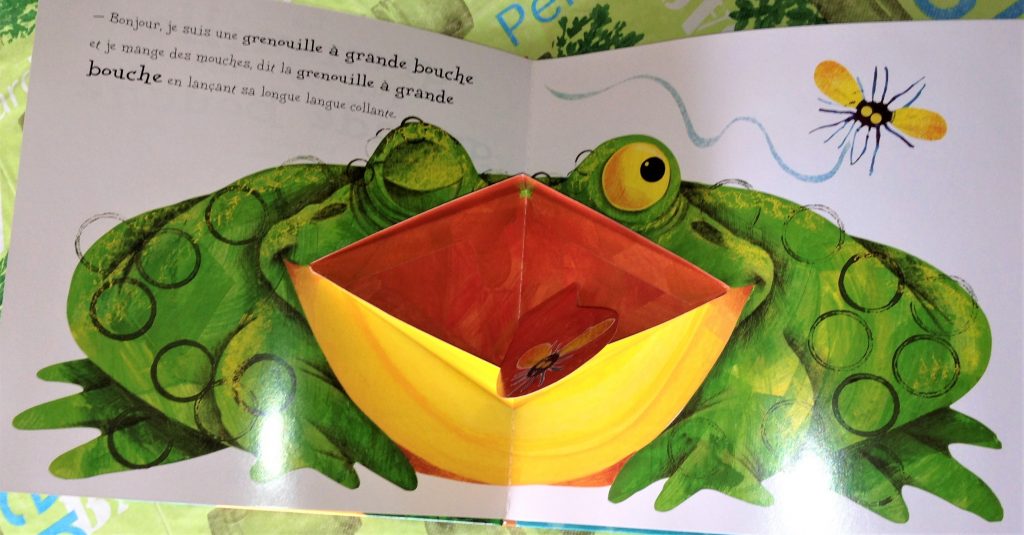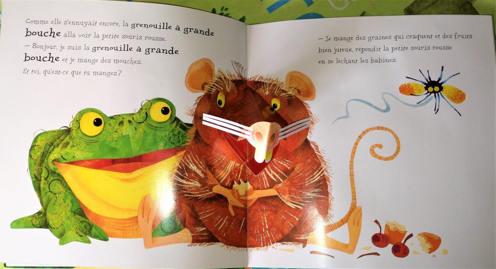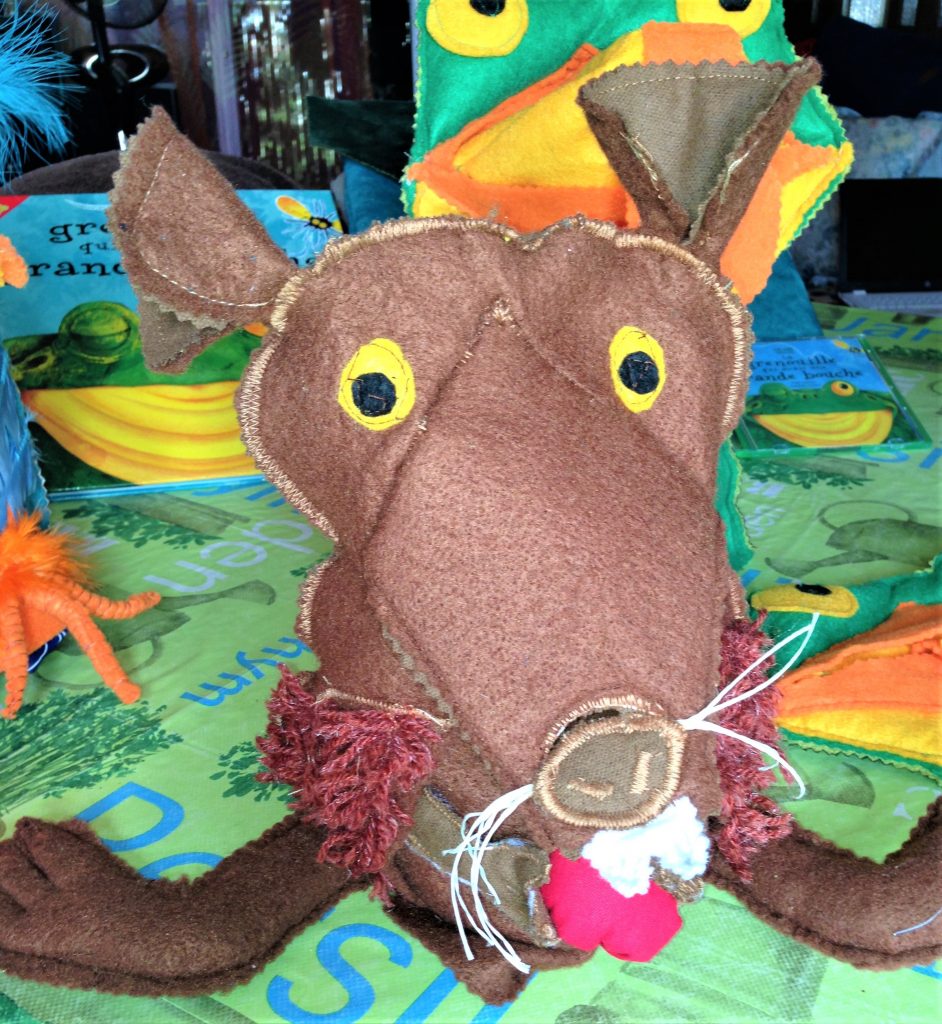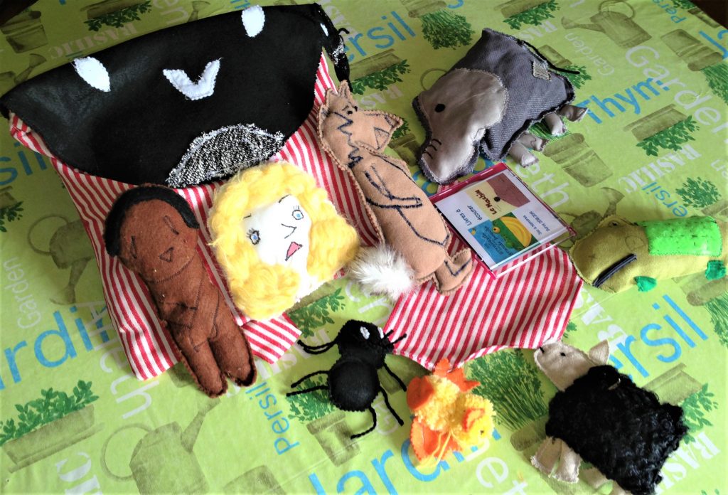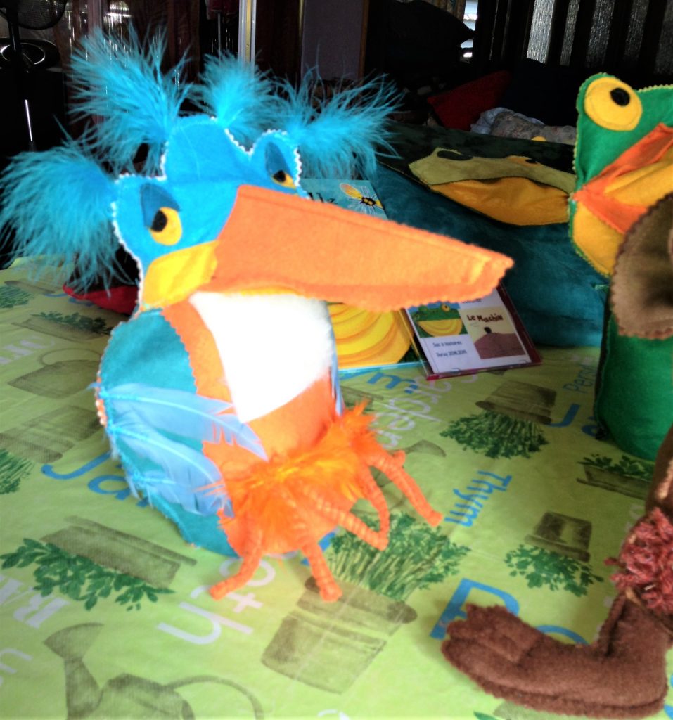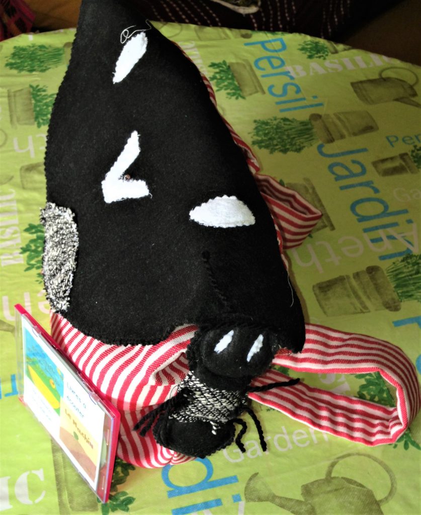 Nous avons fabriqué en tout 12 sacs , 6 pour le thème de la grenouille et 6 pour la fourmi. Bien sûr, ils sont remplis de surprises : on y trouve tous les personnages du livre en marionnettes et un livre, accompagné d’un CD audio qui contient le conte de la grenouille à grande bouche en 7 langues (français, arabe, espagnol, turc, portugais et italien).