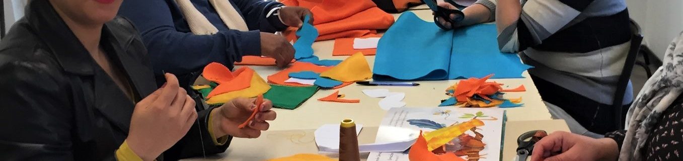 Depuis plusieurs années, l’association le Bas Vert propose des ateliers couture, en collaboration avec l’école Victor Duruy sur le projet « sacs à histoires ». À la réunion parents et enseignants de l’école, on s’est mis d’accord sur le choix des livres, et tout de suite l’association a pris en charge la confection des personnages des livres. Bien sûr, les tissus ont été fournis par l’école, les CD audio ont été réalisés par une collaboration de mamans d’ élèves de l’école, bien choisies pour leur langues différentes. Un technicien son, Imane, Virginie, sa fille, Élisabeth et d’autres adhérentes ont ainsi animé l’atelier avec toutes les mamans des élèves.